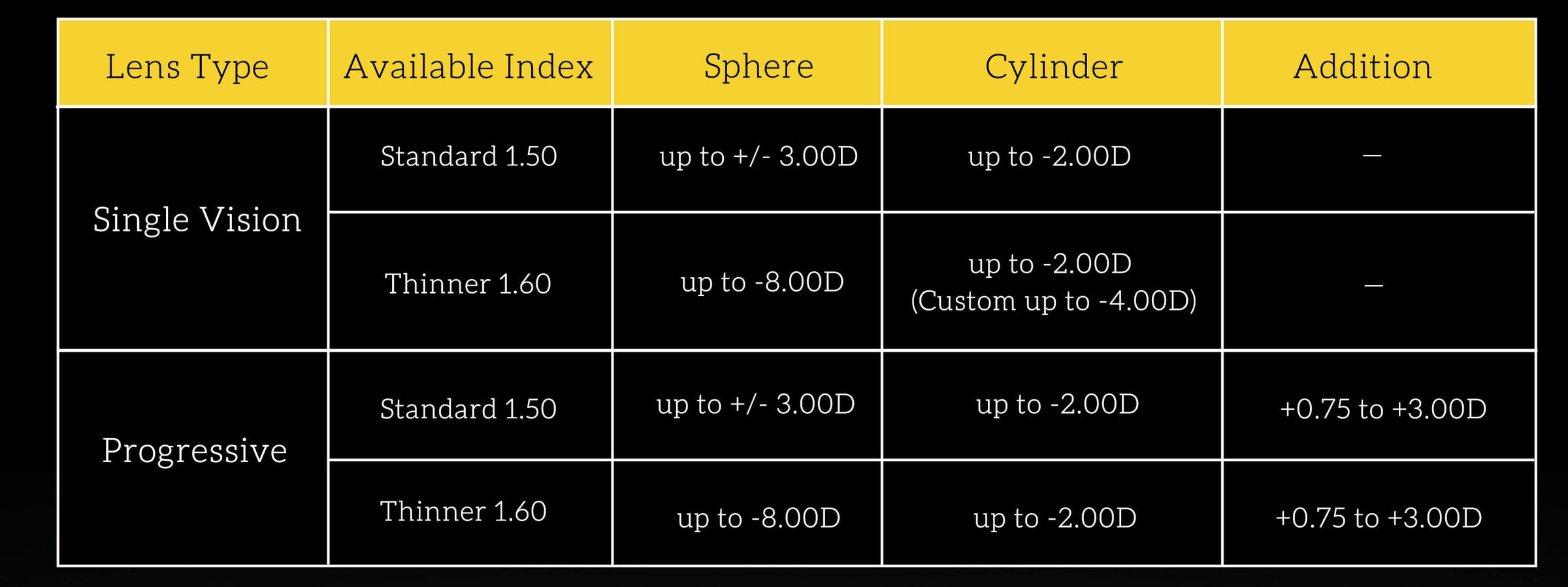 *For prescriptions exceeding the ranges above, please contact our support team for a custom quote.