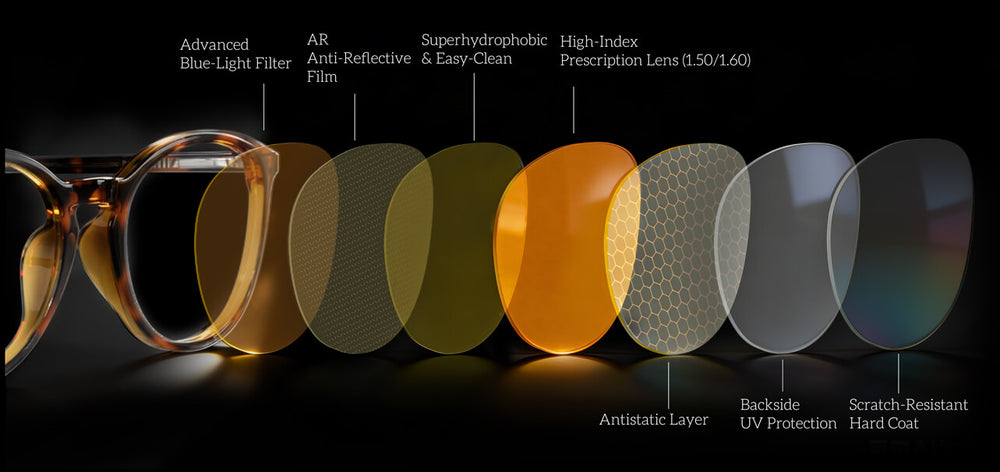 A: Our blue light blocking prescription glasses utilize advanced vacuum-ion coating technology. This high-grade coating is designed to be more durable and less prone to annoying reflections than entry-level options. By effectively filtering out harmful HEV light while maintaining high light transmittance, we provide heavy screen users with a clearer, more natural viewing experience that helps reduce headaches and digital eye strain.
