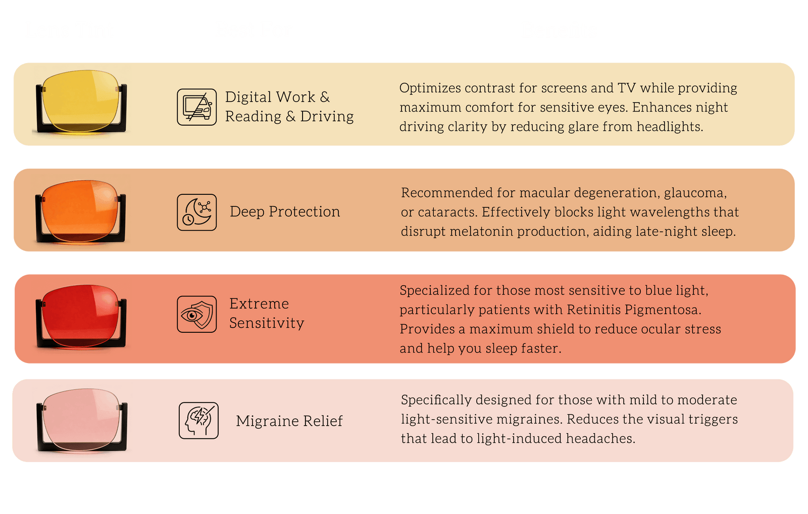 We offer specialized tints for targeted relief. These lenses maintain the same color accuracy and spectral performance as our non-prescription series: