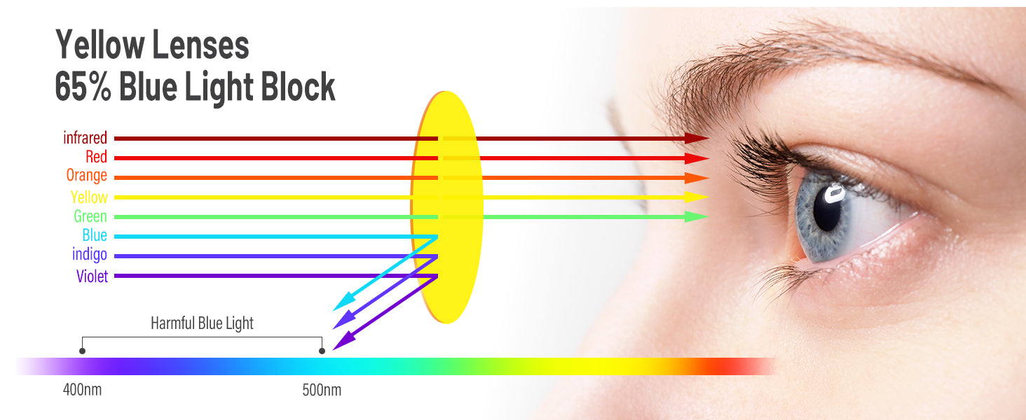 Yellow lenses block more blue light—around 65%—which enhances contrast, reduces glare, and helps you stay comfortable under strong artificial lighting.