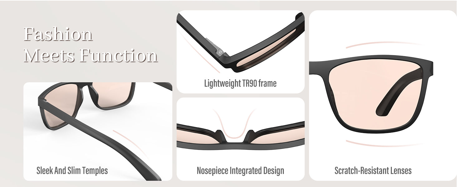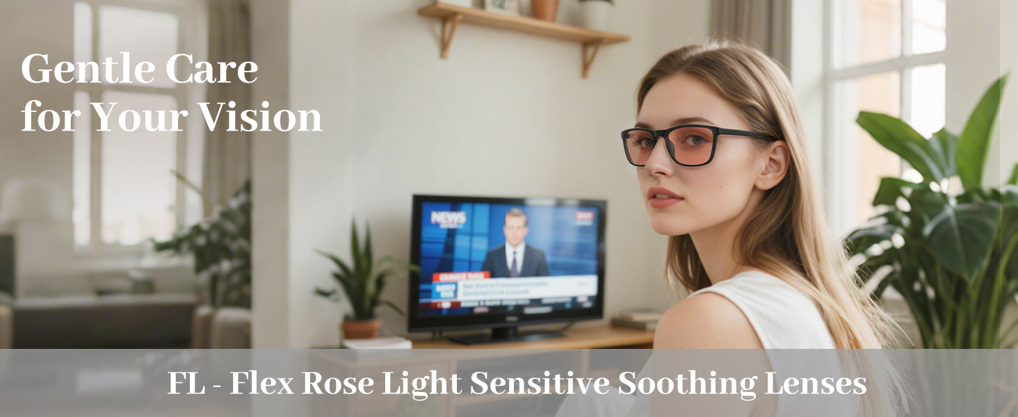 FL-Flex lenses filter the most triggering wavelengths (480–520nm), helping reduce discomfort from bright screens, harsh indoor lighting, and daily visual stress. The soft rose tint gently eases contrast and brightness, offering soothing relief without heavy color distortion.