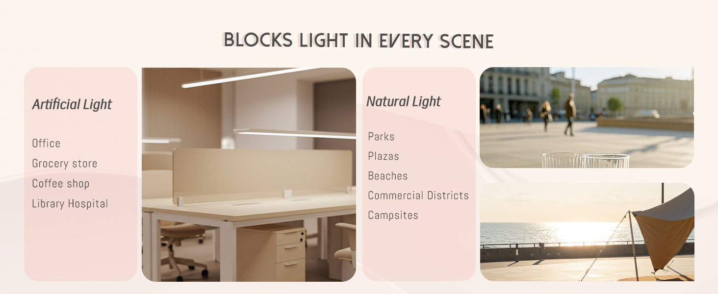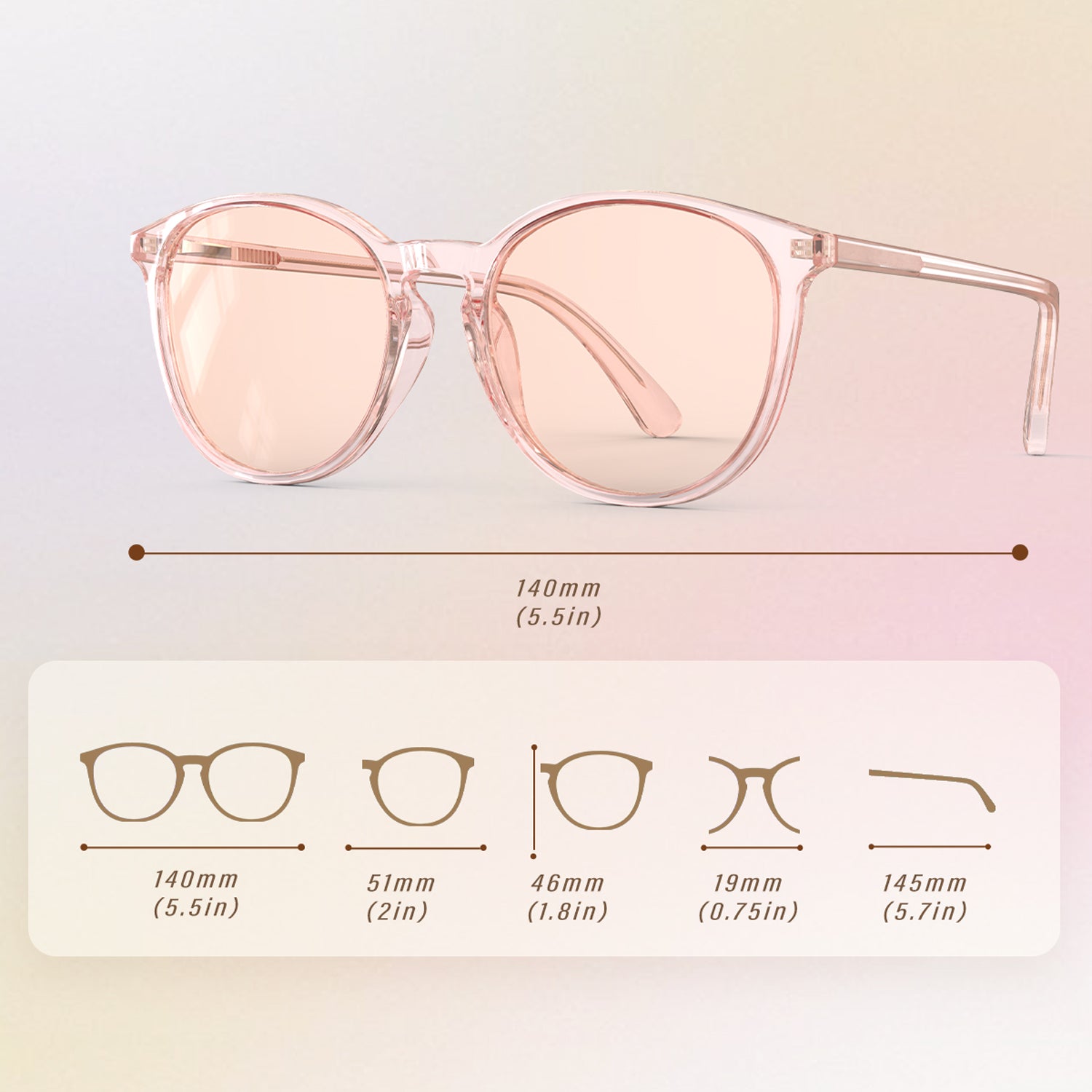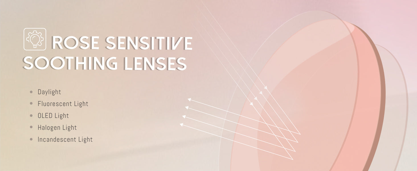 The subtle rose tint reduces sensitivity to contrast and bright indoor lighting, easing eye strain from fluorescent lamps, screens, and glare. It provides a calming visual experience for users with photophobia or migraines, helping soften harsh light in daily environments.