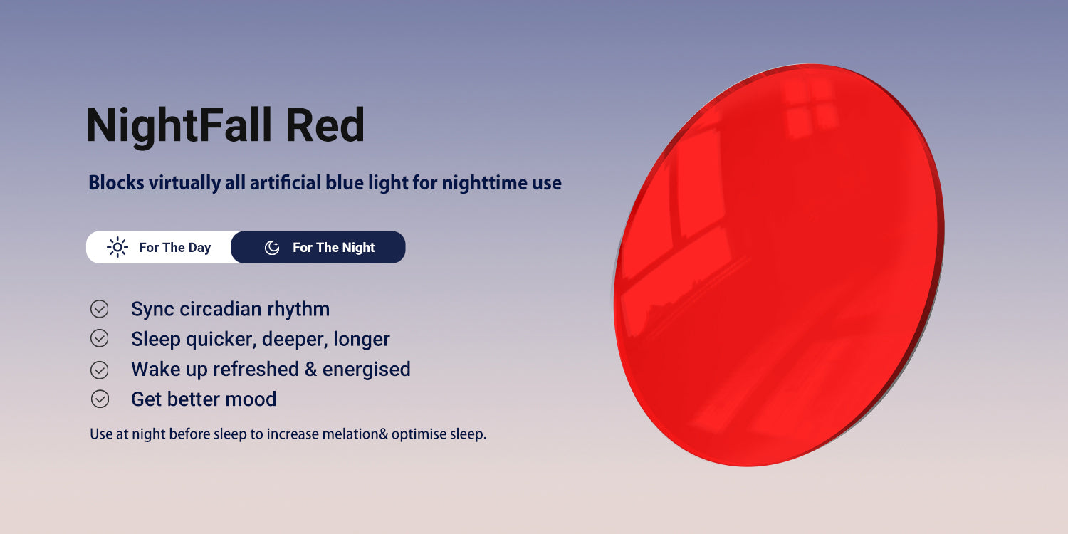 Red lenses block both blue and green light (up to 570nm), providing the strongest protection for melatonin and circadian rhythm — ideal for evening and nighttime wear.